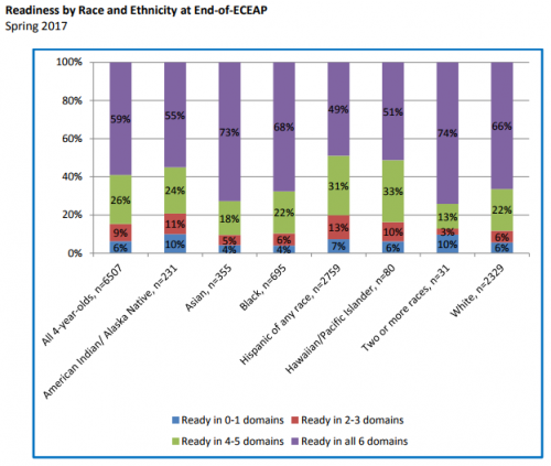 In the chart to the right you still see racial disparities (that we are working on eliminating) but you can see that “Black 4-year-olds” do better than “All 4-year-olds.” This is black 4-year-olds who are below 110% of the federal poverty level and had ECEAP, compared to all income 4-year-olds who might or might not have had preschool. This is the power of high quality preschool. You can see the entire 2016-17 outcome report for ECEAP here.